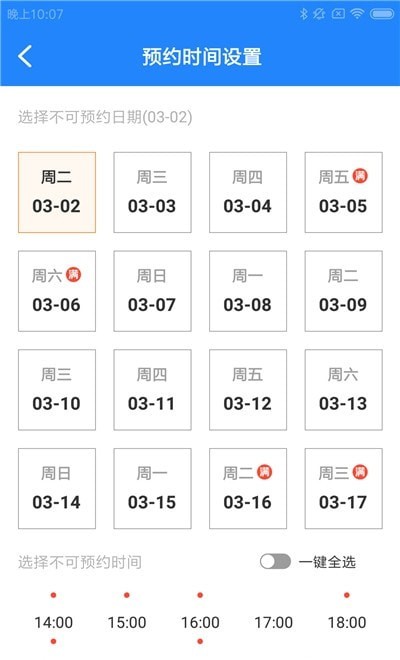 1、可以进行预约时间设置,自行选择不可预约的日期和时间点,支持一键全选。