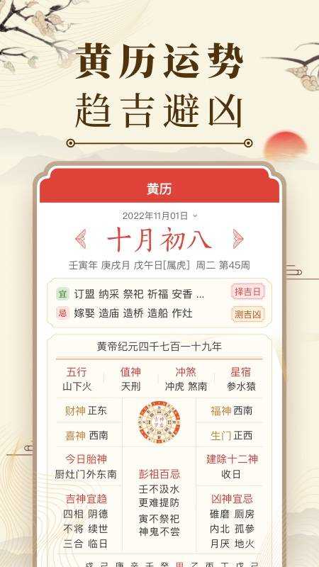 黄历:此应用程序提供黄历,包括吉日、忌日和其他传统信息,以帮助用户做出更好的决策。