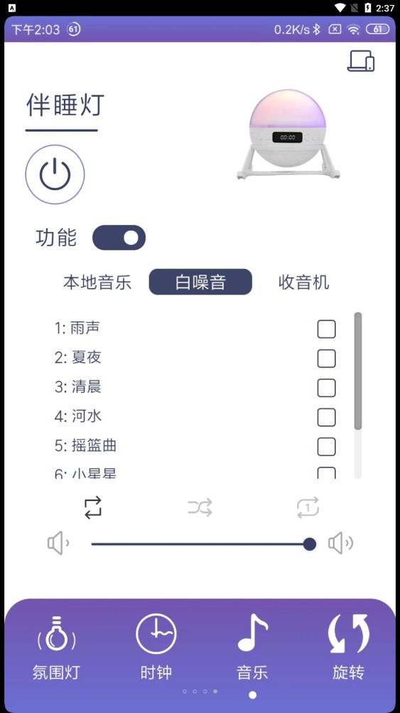 3.为了进行高质量的睡眠,我们耗费了许多心思,有入睡音乐各种各样的助眠方式。用户可以随意的进行选择。