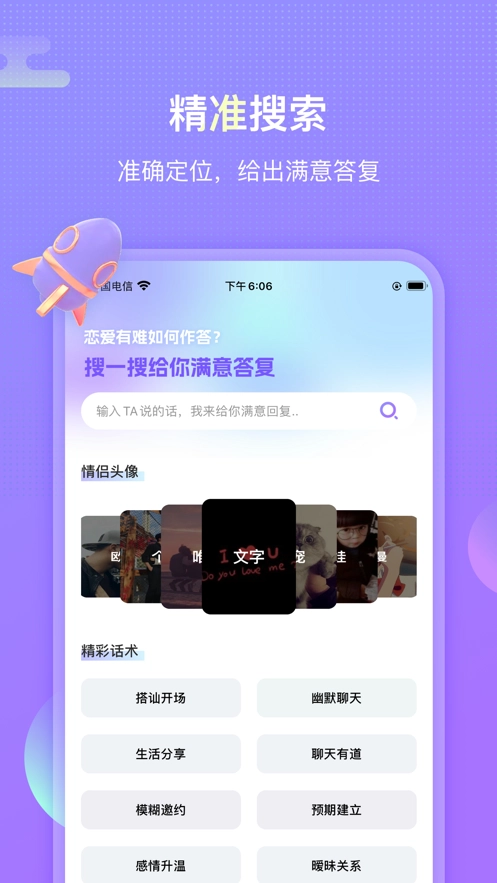 1、聊呗恋爱话术是一款智能关键字搜索APP。