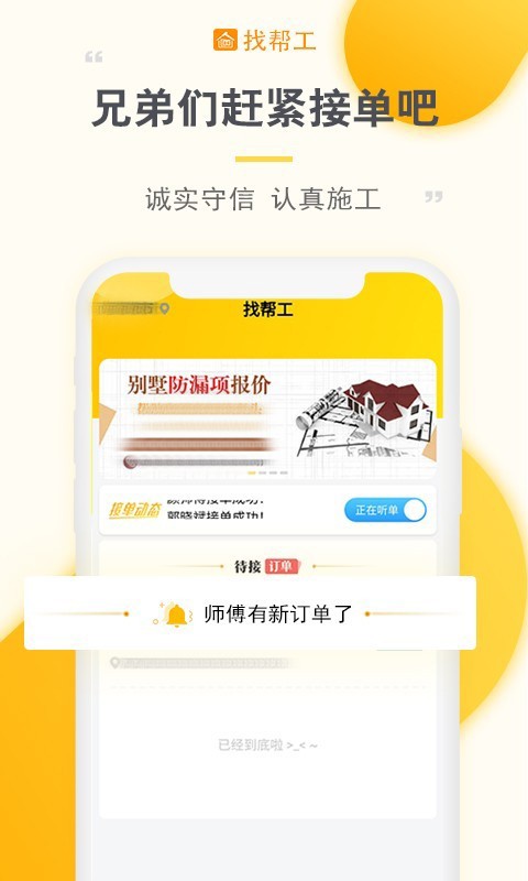 找帮工师傅端,各位装修工人师傅们,在这里自己也能当老板哦,随时可以轻松接单,只要彼此诚实守信,就可以提前说好价,认真工作,踏实施工,立马获益。下载找帮工工人端app,坐在家里,躺在床上,走在路上,驾在车里,随时接装修工程订单。