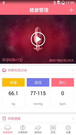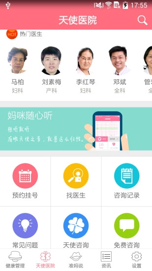 医疗健康管理手机应用,专为孕妈定制,主要有四大板块:健康管理,天使医院,准妈说,资讯,健康管理提供孕期提醒和健康讲堂等等功能.