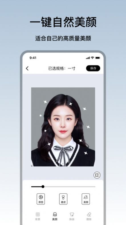 1、照片拍摄后,使用该应用程序的实时修改功能进行照片的微调,确保符合证件照要求;