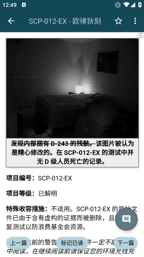 1、这款应用不仅仅是一个收录SCP基金会怪物档案的资料库,还提供了丰富的相关研究资料和详细的SCP编号生物介绍。
