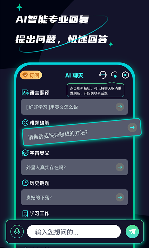 2、为大家提供智能对话服务,根据大家的提问或输入内容进行快速智能回复;
