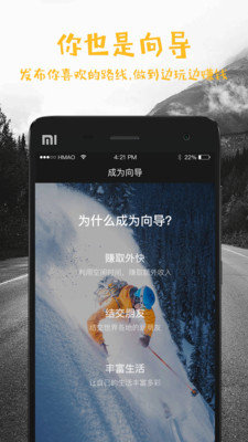 同时,你也可以成为向导,把你所知道的新鲜玩法发布在我们的应用上,让更多志同道合的伙伴加入你的旅途,做到边玩边赚钱。