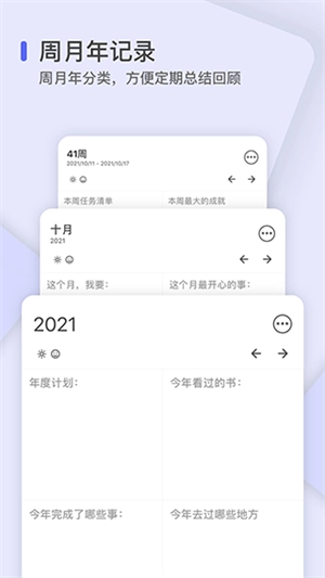 丰富的时间维度让反思日记真正成为我们自我提升的得力助手,通过年月周日层层递进的规划与总结系统进行规划、行动和复盘。一步步分解并实现你的人生目标。
