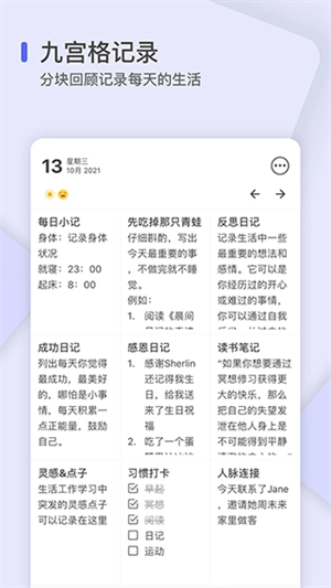 2、采用九宫格形式的日记记录方式,通过日记本的问题模板去规划每天的记录方向。