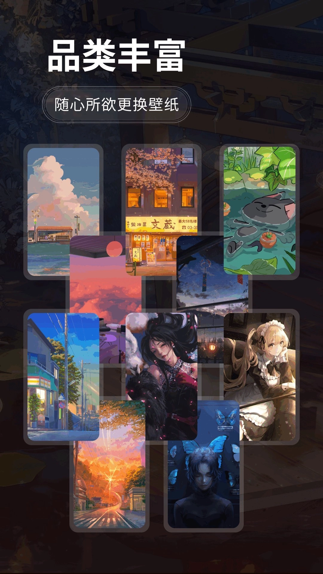 1、拥有多个主题分类,如卡通、动漫、美食、风景等,覆盖了各种壁纸类型,满足用户对不同风格壁纸的需求。