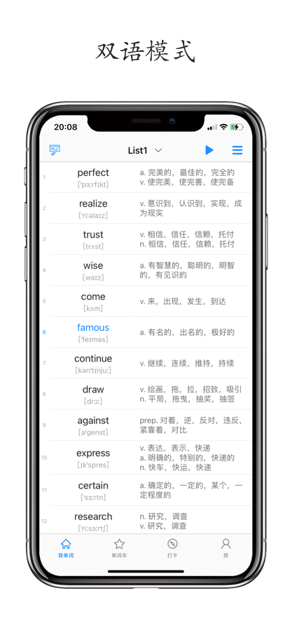 1、学习模式:双语、英译汉、汉译英、听写等多种模式。