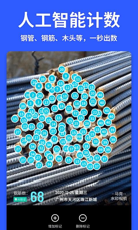1.人工智能计数,钢筋、钢管、木头等材料均可识别,对着对应的目标计数物体拍照即可一秒出数。大幅提升工作效率!