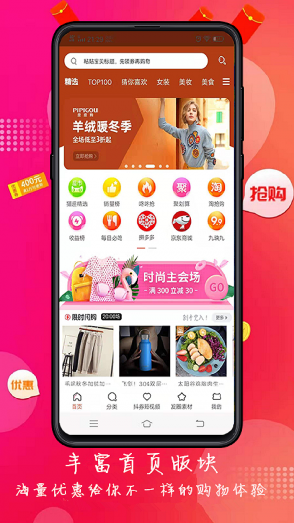 所有商品资源自带优惠券,一键领券购物享受丰厚的折扣优惠;