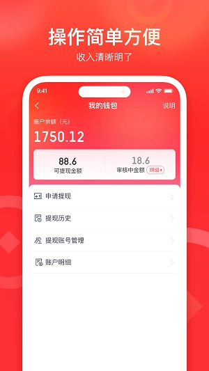 1、推广赚红包:app为用户提供了丰富的推广任务,只需按照要求完成推广,即可获得丰厚的红包奖励。这些任务包括分享链接、邀请好友、下载应用等,简单易懂,操作便捷。