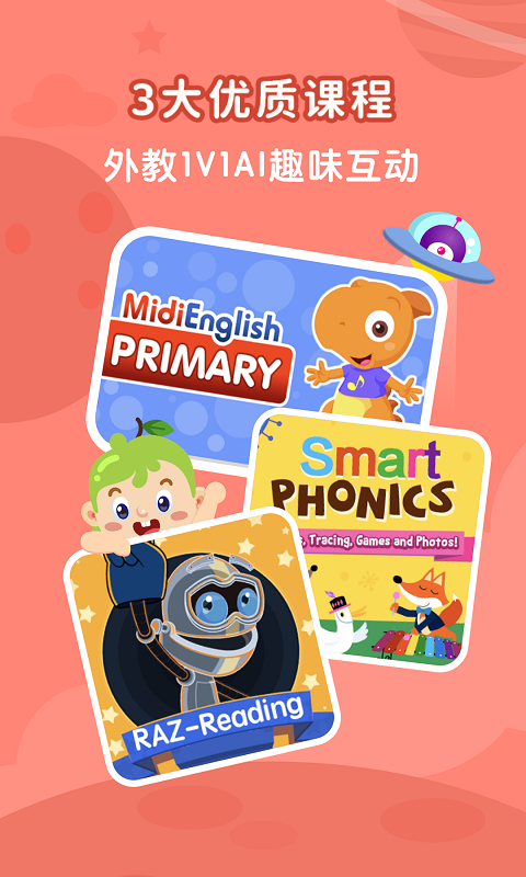 1.MidiEhglish主线课程,选用国际三大语言出版社之一的麦格劳希尔(McGrawHill)的知名英语教程《Midisaurus English》,涵盖3-9岁全系列课程,内容丰富科学,无缝幼小衔接。