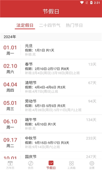 3、法定节假日,热门节日,二十四节气查询,提供倒计日计算。