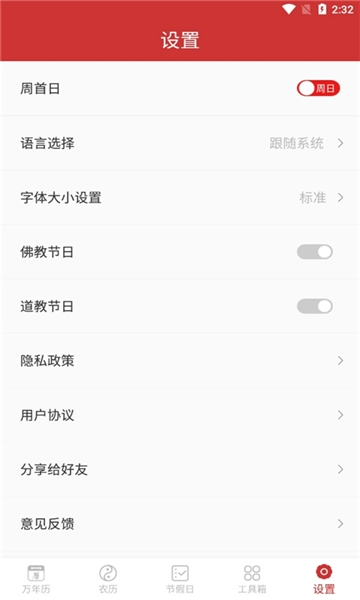 6、支持设置周一或者周日作为一周开始,根据个人偏好自由设置,支持字体大小设置。