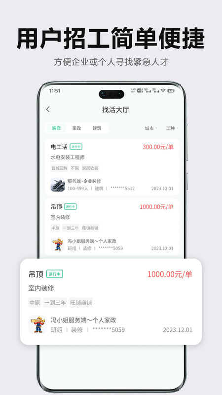 3、提供海量任务发布渠道,用户可以快速发布自己的需求,吸引更多的工人参与,提高服务质量和效率。
