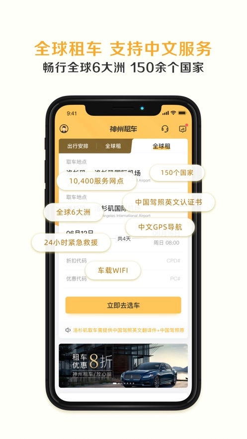 2、全球汽车租赁服务:支持中文服务,畅通全球6大洲150多个国家。