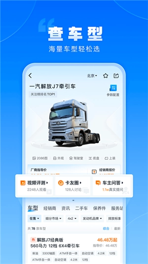 1.买卡车必查,收录9.3万货车参数配置,真实经销商价格,卡车实拍图片126万张。