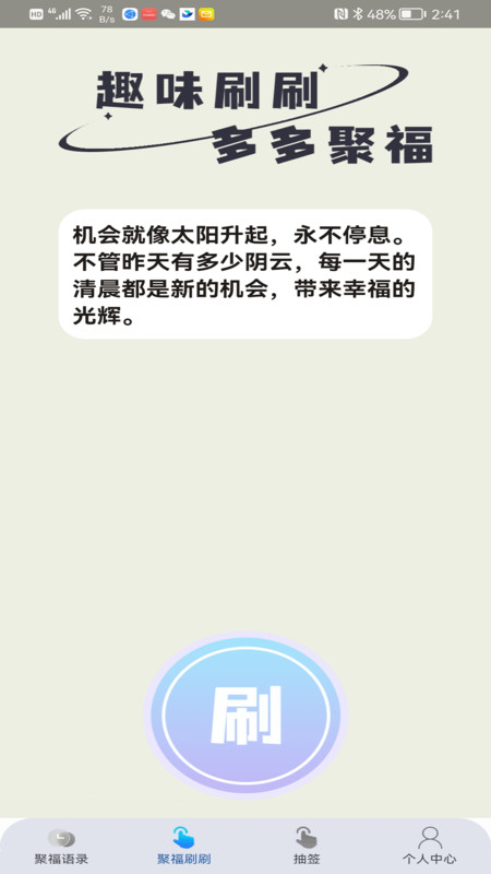 多多聚福是一个充满正能量的软件,多多聚福App提供了大量的正能量语录和句子,这些语录和句子鼓励和激励人们积极向上、乐观向前地面对生活中的挑战和困难。该软件将语录和句子进行了分类和标签,方便用户根据自己的需求和心情浏览和查找相关的内容。