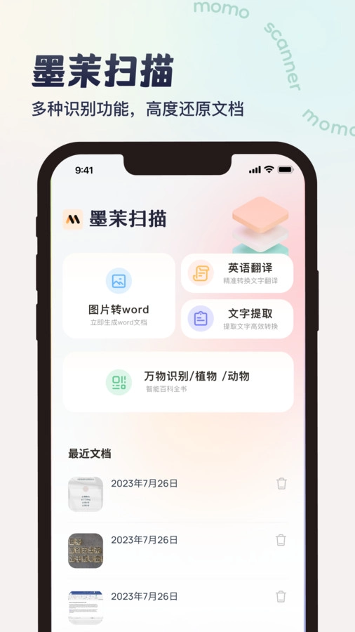 墨茉扫描是一款多功能的扫描识别工具软件,旨在为用户提供便捷、高效的文档扫描和识别功能。该应用支持将纸质文件快速转换为电子文档。用户只需将文件放置在相机下方,并点击扫描按钮,即可自动拍摄并裁剪图像。应用内置的图像处理技术能够清晰地捕捉文档细节,保证扫描效果的高质量。