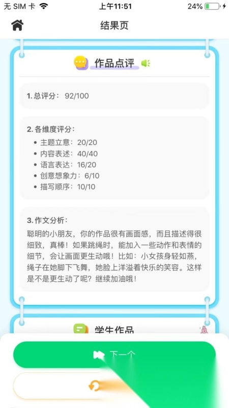 3、能够对用户的作品进行评分和评价,帮助用户及时发现并改正写作中的问题。