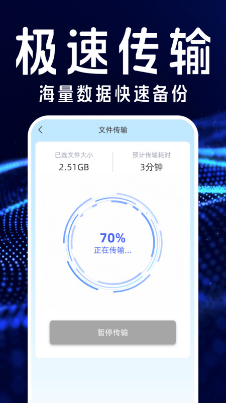1、很多人换机必备,以超级简单的方式,将旧手机内的文件和资料进行备份传输,急速模式,轻松搞定,不需要我们等待哦;