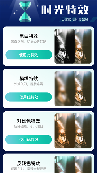 时光特效app是一款拥有丰富特效的app,你可以按照自己的需求来对图片添加特效,特效种类很多,可以很好满足不同用户的需求,让你的照片变得更加精美,喜欢的朋友们快来下载吧!