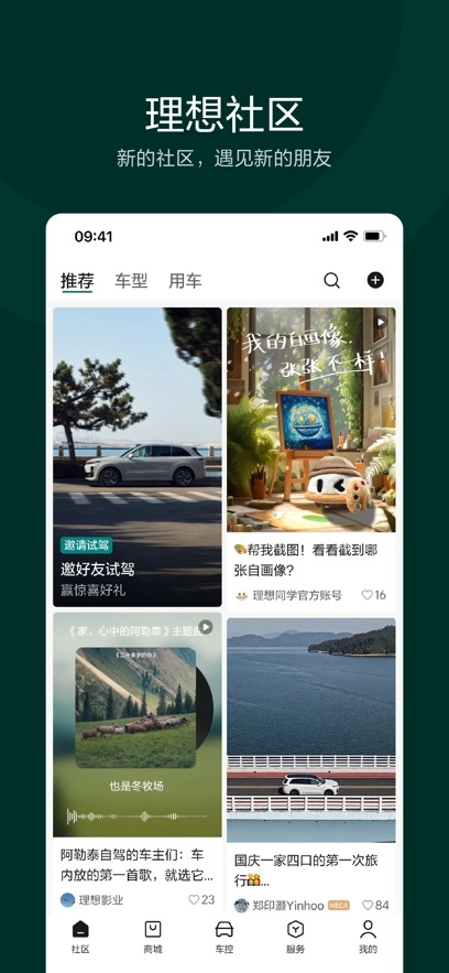 另外,理想汽车App堪称新能源汽车领域的百科全书。它不仅为众多车主提供社交、出行、控车、试驾等一系列服务,还推送大量与汽车相关的文章动态,涵盖问答、导购、参数、试驾等丰富内容,旨在让用户不仅热爱汽车,更能深度了解汽车知识。社区:理想汽车的车友在这里分享最新的车辆体验,客户端工作人员也会发布最新车辆资讯。大家还能在这进行车友问答互动,参与各类社区活动与话题,只要加关注,就能知晓好友的最新动态。理想汽车App是专为用户打造的综合性平台,既能实现对理想汽车的车辆控制,又能让用户及时了解理想汽车的最新资讯,还方便用户与其他车友交流互动。