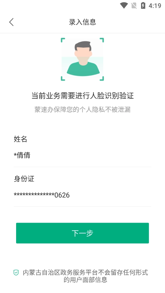 5、确认信息无误后,点击“下一步”,开启人脸识别。