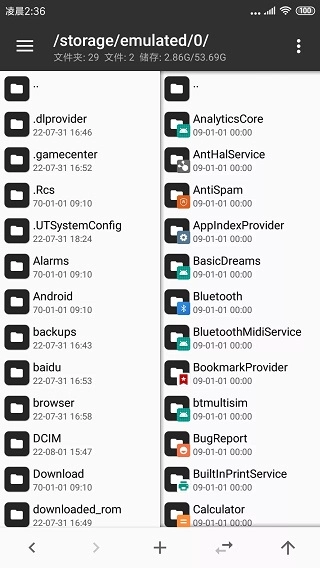 当你打开MT管理器,映入眼帘的是左右两侧各有一个的文件列表窗口。