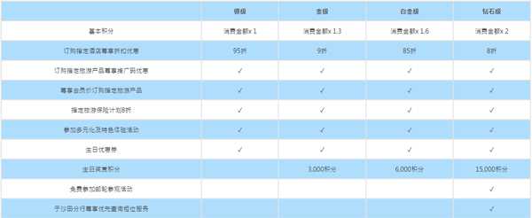 会员一共设有四个级别,分别为银级、金级、白金级以及钻石级。每个级别会员均能专享一系列旅游礼遇。