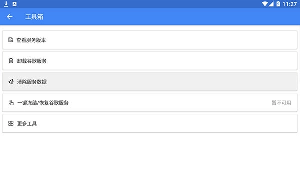 3、点击右上方的工具箱菜单,其中包含查看版本、卸载谷歌三件套、清除数据等功能。