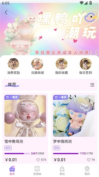 嘿鸭吖潮玩,这可是一款手机潮玩手办商城平台哟,它专门是为那些热爱盲盒的玩家精心打造的。这软件可厉害啦,能让你在线上抽盲盒、玩一番赏,还能开卡呢。里面包含了超多热门的 IP 系列。要是你有想买的,输入关键词就能选购。而且只要完成平台任务,就能领取超值皮肤哦。还有超人气品牌盲盒供应呢。要是你对这软件感兴趣,不妨点击体验一下呀!