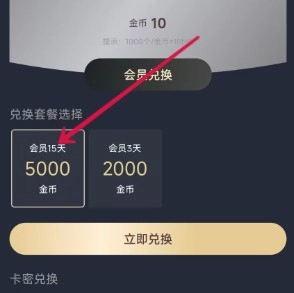 第二步:手机软件具备金币兑换功能,其中5000金币能够兑换15天会员,2000金币可以兑换3天,你可从中选择一种。