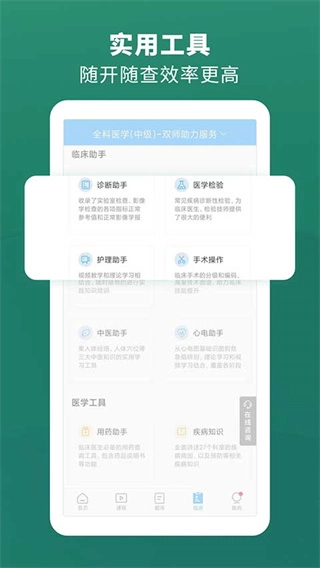章节练习、模拟考场、错题笔记、考试指南等多种功能助力复习,还有各类临床助手与医学小工具,随时开启使用,让日常巩固更加便捷。