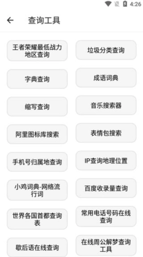4、点击打开查询工具,便能查看王者荣耀最低战力地区、进行垃圾分类相关查询、字典查询、成语查询、缩写查询以及表情包搜索。