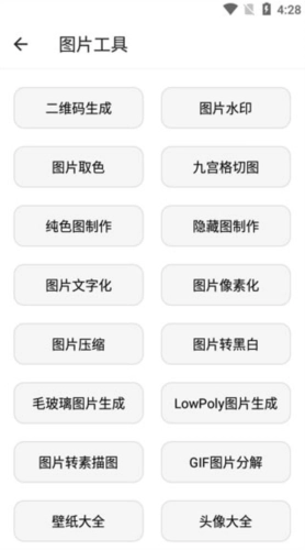 3、图片工具包含:二维码生财、图片水印添加、图片文字提取、GIF图分解操作、壁纸资源汇总、头像资源汇总。
