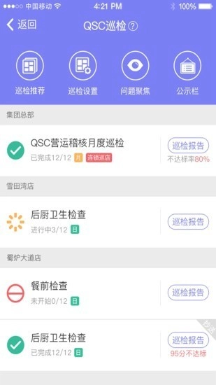 2. 可支持对后厨卫生检查、餐前检查以及营运月度检查情况进行查看。