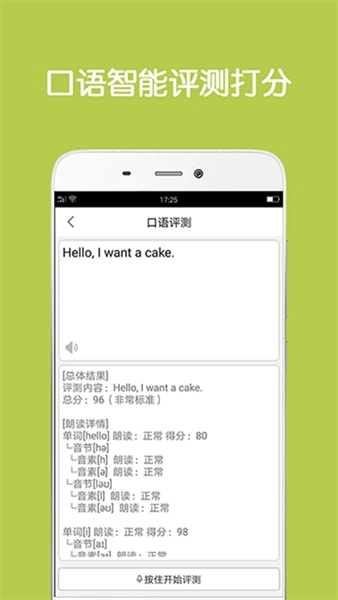 4、线上跟读与评分功能,用户可针对系统给出的单词或句子进行在线跟读,随后系统会给出相应评分。
