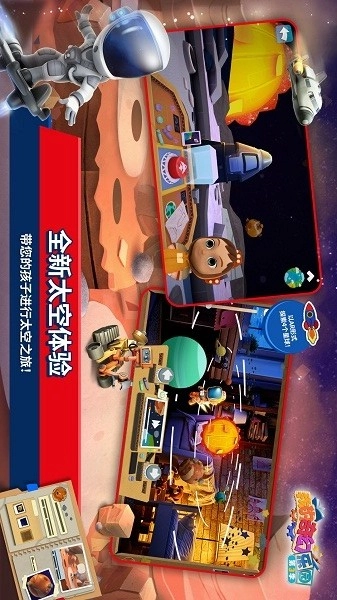 踏上飞船,一同见证孩子首次宇宙远征,感受“太空任务”带来的刺激与欢乐!孩子们即将登上宇宙飞船,开启太空航行之旅,去探索月球以及其他众多星球。在执行任务的过程中,孩子们会收集各类新奇发现,并记录进故事报告里,星球的神秘面纱将逐一为他们揭开!
