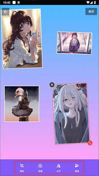3、现在能够自由移动每张图片的位置。要是想对图片进行编辑,只需单击图片,就可为其进行【裁剪】操作,添加【滤镜】,或者执行【水平】、【垂直】反转等操作。