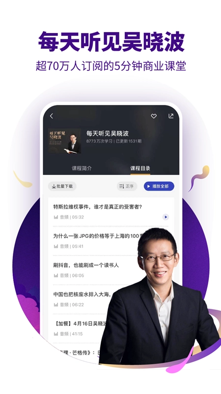 每日清晨7点,超70万人准时守候的商业日课,聚焦宏观经济、商业解读、企业经营与投资理财四大关键板块。与吴晓波的追随者们一同,研习企业家的独到商业思维,洞察时代发展趋势,挖掘当下潜藏的投资机遇。