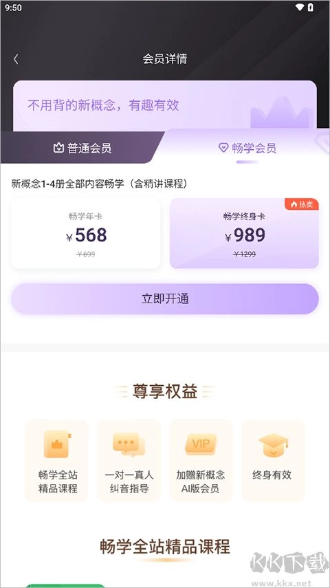 畅学会员包含App 的所有内容和系统课程,普通会员权益+系统课程,课程包括App底部标签“课程"处的所有课程,具体包括:新概念1-4册课程(一册二册课程已上线,三册2023年5月底上线,四册2023年下半年上线),系统发音课、自然拼读课、口语课、语法课
