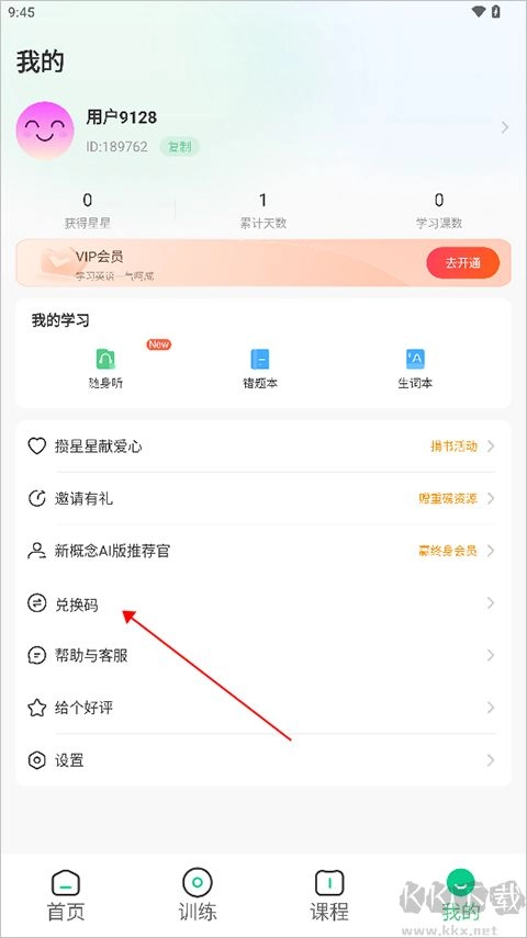 当用户打开并登录新概念AI版,进入【我的】页面,点击【兑换码】。