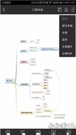 2、如果你想将已经保存在个人云里的导图保存至手机本地,可以在编辑界面点击右上角的工具按钮,选择“转为本地”,就可以将文件转存到手机本地存储空间里了。