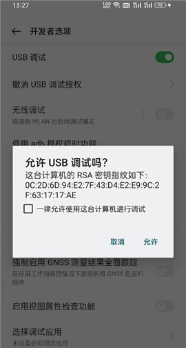 使用数据线连接手机与电脑,在连接过程中,无论何时若出现“允许USB调试”的询问窗口,都要选择允许。