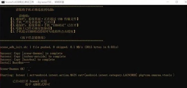 回到电脑端,用鼠标双击图1中的“一键安装Scene5_并激活ADB模式”批处理文件,根据界面提示点击任意键继续,直到出现Scene-Daemon OK等提示信息后,就代表激活成功。正常来讲手机端会自动打开Scene5软件的工作模式选择界面。