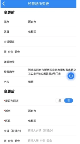 5、经营场所变更同样简单,填入新信息,轻轻按下按钮,就能轻松完成!
