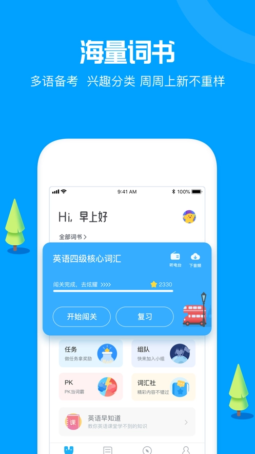 在这儿背单词,能拥有游戏化背词的独特体验,与好友来一场激烈的PK大战,还有排行榜激励机制激发斗志,更能在社团里尽情讨论吐槽……不仅能让自己变得更好,最重要的是,你会乐在其中!